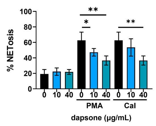 Effect of dapsone on NETosis. Neutrophils were treated with two concentrations of dapsone and stimulated for 4 h. Afterward, the cells were stained with the fluorescent dye Syto Green to measure NETosis by fluorescence intensity. The results were presented as a percentage of NETosis. Values are given as mean ± SD from 3 independent experiments carried out with different donors. * p < 0.05 and ** p < 0.01 compared to the corresponding control groups, as indicated.