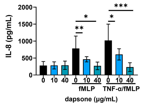 Then, we assessed the levels of IL-8 from the supernatants after 18 h of incubation. Priming with TNFα appeared to be the strongest inducer of IL-8 secretion in all the groups (Figure 5). We found that dapsone significantly reduced the production of IL-8 in a dose-dependent manner in both stimulated cultures. However, no significant difference in IL-8 production was observed in resting neutrophils.