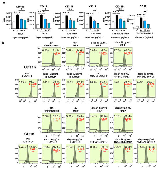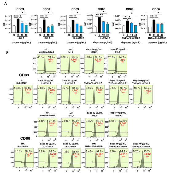 CD66, primarily recognized as a marker of specific granule degranulation, also plays a key role in neutrophil β2 integrin-mediated functions such as transmigration, adhesion to the extracellular matrix, and the induction of respiratory burst. Furthermore, CD66 facilitates the secretion of stored IL-8 [75]. In this context, the downregulatory effect of dapsone on CD66 expression observed in our study represents an additional mechanism contributing to its anti-inflammatory properties.