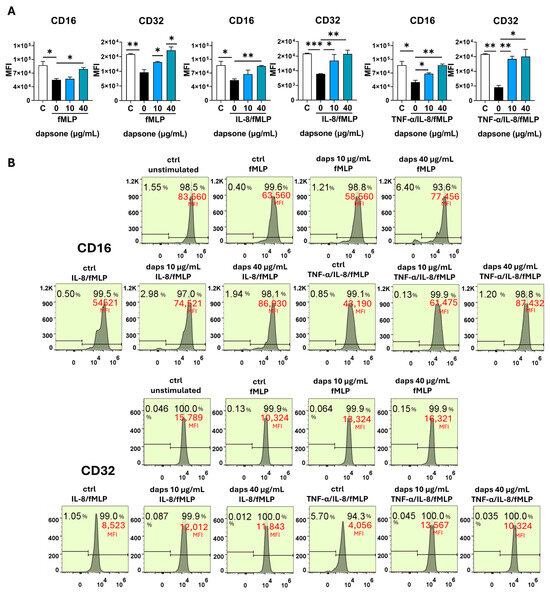 Effect of dapsone on the neutrophil phenotype. After incubation with dapsone (10 μg/mL and 40 μg/mL), neutrophils were activated with fMLP or primed with cytokines and then subsequently stimulated with fMLP. (A) The expressions of CD16 and CD32 are represented as mean fluorescence intensity (MFI) (mean ± SD from 3 independent experiments). (B) The representative histograms from one experiment. * p < 0.05, ** p < 0.01, and *** p < 0.001 compared with corresponding controls as indicated. C = control, unstimulated neutrophils.