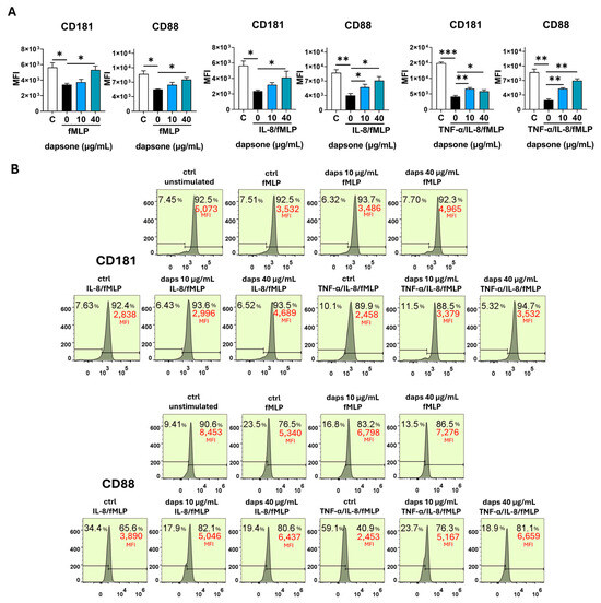 Effect of dapsone on the neutrophil phenotype. After incubation with dapsone (10 μg/mL and 40 μg/mL), neutrophils were activated with fMLP or primed with cytokines and then subsequently stimulated with fMLP. (A) The expressions of CD181 and CD88 are represented as mean fluorescence intensity (MFI) (mean ± SD from 3 independent experiments). (B) The representative histograms from one experiment. * p < 0.05, ** p < 0.01, and *** p < 0.001 compared with corresponding controls as indicated. C = control, unstimulated neutrophils.