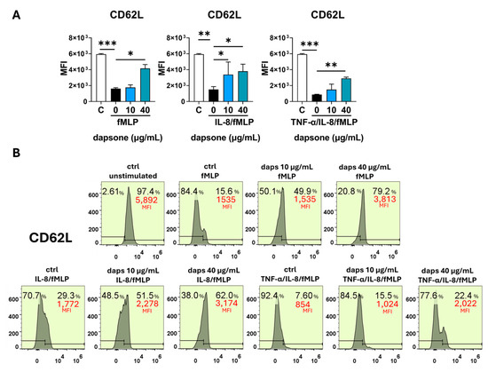 Effect of dapsone on the neutrophil phenotype. After incubation with dapsone (10 μg/mL and 40 μg/mL), neutrophils were activated with fMLP or primed with cytokines and then subsequently stimulated with fMLP. (A) The expression of CD62L is represented as mean fluorescence intensity (MFI) (mean ± SD from 3 independent experiments). (B) The representative histograms from one experiment. * p < 0.05, ** p < 0.01, and *** p < 0.001 compared with corresponding controls as indicated. C = control, unstimulated neutrophils.