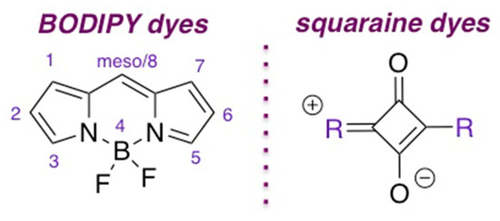 Among the numerous classes of fluorescent molecules, squaraine and BODIPY dyes (Figure 1) are arguably the most versatile scaffolds due to the tunability of their photophysical properties by introducing structurally and functionally diverse moieties [18,19,20,21,22,23,24,25,26,27]. Interestingly, both dyes were first synthesized by Alfred Treibs and coworkers in 1965 (squaraine) [28] and 1968 (BODIPY) [29].
