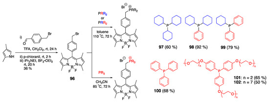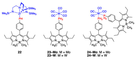 The ability of 18 to form air-stable fluorescent complexes with other metals was also demonstrated (Figure 3) [46]. Molybdenum- and wolframium-containing mono- and di-BODIPY complexes 23 and 24 were prepared in a facile manner, using photochemical and thermal approaches, respectively, and then isolated using column chromatography. The photophysical properties of these dyes were nearly identical to 18, indicating the lack of interaction between metal–phosphine moieties and BODIPY core.