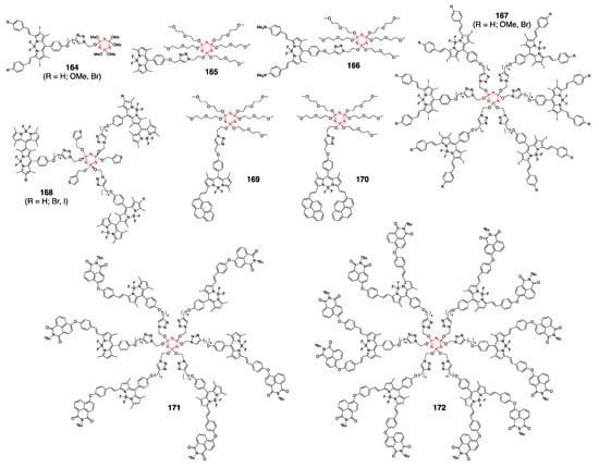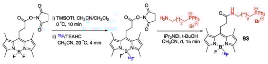 Mitochondria are subcellular organelles critical to a variety of biological functions [62,63,64,65]. Due to its negative membrane potential of mitochondria, incorporation of lipophilic cations onto dyes’ scaffolds allows for specific delivery and imaging of mitochondria. Trisubstituted phosphonium moieties, primarily triphenylphosphonium/(Ph3P+), have been incorporated onto a wide range of fluorescent dye scaffolds [66,67]. Recently, the use of BODIPY dyes for mitochondrial imaging was comprehensively reviewed [68,69]. Here, selected dyes with distinctly different structural features are highlighted, i.e., 73–91 (Figure 5) [70,71,72,73,74,75,76,77,78,79,80,81,82,83,84,85,86,87,88].