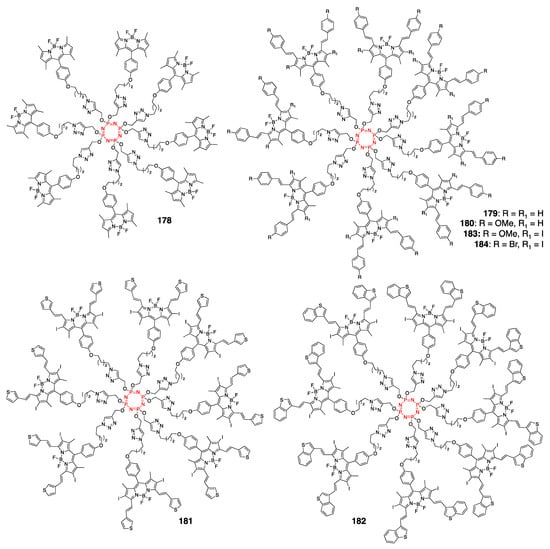 - Çetindere, S.; Oguz Tümay, S.; Kiliç, A.; Durmus, M.; Yesilot, S. Synthesis and physico-chemical properties of cyclotriphosphazene-BODIPY conjugates. Dyes Pigments 2017, 139, 517–523. [Google Scholar] [CrossRef]