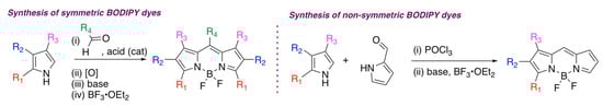 Synthesis of symmetric BODIPY dyes generally relies on an acid-catalyzed condensation reaction between carbonyl-containing compounds (primarily aldehydes and acid chlorides) and various pyrroles, followed by the oxidation that generates a conjugated system and subsequent installation of BF2-moeity under basic conditions (Scheme 1, left) [18,19,20,21,22]. Non-symmetric BODIPYs are synthesized in a similar manner (Scheme 1, right). Typically, these syntheses of BODIPYs could be accomplished in one pot, either using solution and solid (mechanochemical) approaches, followed by chromatographic purification.