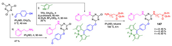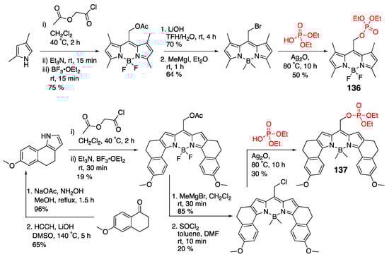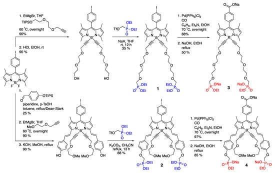 Incorporation of phosphonate groups onto the dyes’ scaffolds resulted in water-soluble BODIPY dyes 1–4 [36] (Scheme 3) as well as 5 and 6 [37] (Scheme 4), with the phosphonate groups being incorporated into various positions of the BODIPY scaffold. Not surprisingly, λabsmax/λemmax for dyes 3 (500 nm/509 nm) and 4 (638 nm/654 nm) appeared to be very similar to typical BODIPY and styryl-BODIPY dye due to the remote, non-conjugated to BODIPY-scaffold nature of the phosphonate group. Due to the high polarity of the phosphonate group, drawbacks were encountered that potentially limit the utilization of these types of dyes. Specifically, the high polarity of the phosphonate group, while enhancing water solubility, often compromises dye stability under physiological or acidic conditions and limits membrane permeability, posing significant challenges for both synthesis and biological applications. Dye 5 was found to be unstable, resulting in a yield that was too low to quantify following HPLC purification [37]. Dye 6 appeared to be more stable, yet reverse-phase chromatography had to be used to obtain the pure dye.