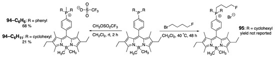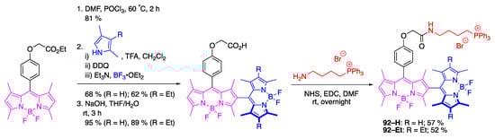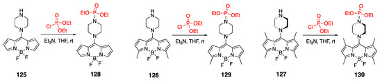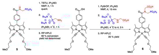 On the other hand, dye 6 (Scheme 4) exhibited a superior quantum yield (i.e., Φf = 0.76) compared to other prepared water-soluble BODIPYs (Φf was in the 0.36–0.59 range) [37]. This was attributed to a restricted rotation of the tertiary amide moiety, which was theorized to have reduced the probability of non-radiative pathways. Despite the dye’s advantageous level of brightness, it was mentioned that the phosphonic acid group could be an impediment to cell permeability of this dye, potentially limiting its used as a probe in imaging applications.