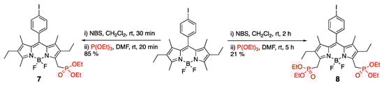 The varying reactivity of the methyl groups at different positions on the BODIPY scaffold enabled selective bromination at the 3- and 5-positions, followed by reaction with triethyl phosphite to yield mono- and di-phosphonate-containing BODIPY dyes 7 and 8 (Scheme 5) [38].