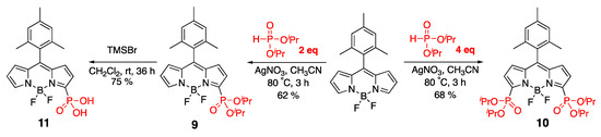 Silver-mediated one-step phosphonate-group installation onto the BODIPY scaffold provided entry to mono- and di-substituted (i.e., 9 and 10, respectively) dyes by simply adjusting the amounts of dialkyl phosphite (Scheme 6) [39]. Furthermore, 9 was converted into a water-soluble 11 (Scheme 6), and the high solubility of 11 in aqueous media (water, pH 6 and pH 8) was supported by the fact that the photophysical properties of 11 in water were closely related to those observed in DMSO.