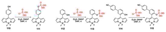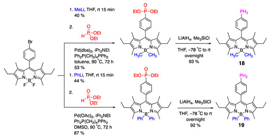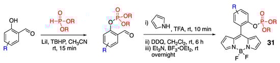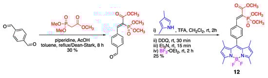Unlike the aforementioned examples, which relied on modification of the BODIPY scaffolds, an alternative, more modular strategy utilized the incorporation of phosphonate group onto terephthalaldehyde, which was subsequently used to make BODIPY dye 12 (Scheme 7) [40]. λabsmax/λemmax 12 (488–492 nm/511–518 nm) in several solvents (e.g., toluene, CH3CN, EtOH, and CH2Cl2) indicated that the phosphonate group did not have an appreciable impact on its photophysical properties.