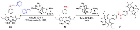Dye 18 was also shown to undergo several additional transformations enabled by zirconium catalyst A (Scheme 10) [45]. A catalyzed hydrophosphination and dimerization of 18 to give dyes 20 and 21, respectively [45]. λemmax for these dyes (i.e., 20 and 21) were very similar to the parent dye 18. 31P and 1H NMR study (as well as LC-MS) indicated that 21 existed as a mixture of rac and meso isomers. Thus, the potential rotor-like behavior, along with their associated applications as viscosity and temperature sensing, could be of interest. The zirconium-containing dye 22 (Figure 3), suggested to be the reactive catalytic species, was synthesized by simply reacting equimolar amounts of 18 with A (Scheme 10) in toluene for 10 min, following low-temperature crystallization. However, no photophysical properties for 22 were reported.