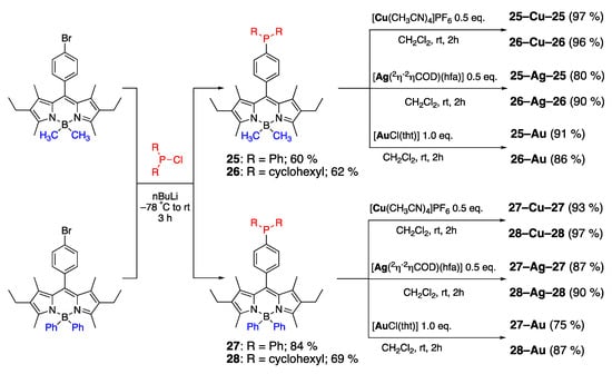 Tertiary phosphine-containing BODIPY dyes 25–28 were investigated for their ability to form various complexes group 11 metals, i.e., Cu, Ag, and Au, also known as coinage metals (Scheme 11) [47]. Monomeric and dimeric metal complexes were obtained by simply controlling the stoichiometries. Notably, isolation and purification of these complexes was performed either by recrystallization or column chromatography. In general, it was shown that the incorporation of the metal center had a negligible effect on the λabsmax/λemmax and quantum yields of these dyes, yet the extinction coefficients for dimeric complexes were nearly doubled compared to the parent dyes.
