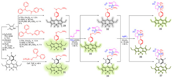 Tethering phosphine moieties to the BODIPY scaffold [48] enabled the investigation of how metal complexation could be used to control fluorescence emission (Scheme 12). Phosphino-amine 29 and phosphino-thioethers 30 and 31 both demonstrated complimentary OFF-ON fluorescence responses upon specific complexation with Pt(II), with these responses being further modulated by chloride ions through induced coordination changes. Specifically, emission (fluorescence quantum yield, Φf) of 29 was relatively low (Φf = 0.07), and it was further decreased upon Pt-coordination, i.e., 32 (Φf = 0.03); yet removal of Cl– from the coordination sphere of Pt resulted in a relatively emissive 35 (Φf = 0.32). The opposite trend was observed for 30 and 31: the emission gradually decreased from 30/31 (Φf 0.83/0.91) to 33/34 (Φf 0.64/0.76) to 36/37 (Φf 0.15/0.16) [48].