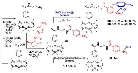In an effort to develop novel metal-containing therapeutic agents, 38 scaffold was prepared [49], followed by incorporation of Ru, Os, and Au to give dyes 38-Ru, 38-Os, and 38-Au, respectively (Scheme 13). As expected, due to the remote position of the phosphine and metal moieties from the BODIPY core, both λabsmax and λemmax remained relatively unchanged upon metal complexation. Small changes in the quantum yields were attributed to possible photoinduced electron transfer (PET) processes associated with the presence of Ru(II) and Os(II) centers. Confocal microscopy studies revealed that these dyes preferentially accumulate in the cell membrane. Importantly, all three dyes exhibited cytotoxicity toward ovarian cancer cell lines (e.g., A2780S and A2780cisR), albeit the cytotoxicity was inferior to that exhibited by cisplatin.