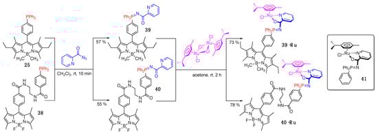 To aid in the visualization of Ru-containing drug candidates, several BODIPY dyes were prepared (Scheme 14) and evaluated for their toxicity toward cancer lines as well as their ability to suppress cancerous tumor growth [50]. Specifically, dyes 25 and 38 underwent Staudinger reaction with 2-pyridinecarbonyl azide to give dyes 39 and 40, which were subsequently metalated, to produce air-stable 39-Ru and 40-Ru, respectively (Scheme 14) [50]. Although λabsmax/λemmax did not change appreciably as the PPh2 functionality was gradually elaborated into iminophosphorane and Ru-iminophosphorane, the quantum yield decreased appreciably upon incorporation of the Ru center. The quenching effect is especially pronounced for 39-Ru, where Ru is located nearer to the BODIPY core (i.e., direct interaction between the metal center and the BODIPY), which was attributed to PET and/or increased contribution of the triplet states. Confocal microscopy revealed that, similarly, these dyes accumulated in the nucleus, mitochondria, and cytoplasm. Although BODIPY allowed for fluorescent tagging of the Ru-complexes, BODIPY moiety had a negative impact on cytotoxicity (e.g., IC50 values for 39-Ru and 40-Ru were over an order of magnitude higher as compared to 41 in several cell lines, including triple-negative breast cancer/MDA-MB-231, non-tumorigenic breast/MCF10a, and lung fibroblasts/IMR-90).