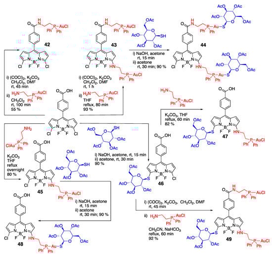 Leveraging multiple functionalization points of the BODIPY core, more advanced theranostic BODIPY platforms were synthesized, featuring tunable selectivity, solubility, cytotoxicity, and optical imaging capabilities (Scheme 15) [51]. The photophysical properties of 42–49 (λabsmax/λemmax were in the range of 475–516 nm/533–570 nm) did not show significant correlations as a function of structural variation, and they were acceptable for in vitro investigations. Confocal imaging revealed that these dyes mostly accumulated in the cytoplasm and/or membrane. Notably, the presence of two Au centers, i.e., 43, 44, and 49, did not provide increased Au uptake. Although Au uptake was found to correlate with cytotoxicity, the cytotoxicity of these dyes toward human breast, murine mammary, and human melanoma cancer cell lines was relatively low, with IC50 values being in the 20–100 μM range, indicating limited cytotoxic potential [51].