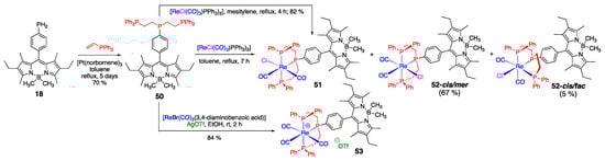 Due to the potential of rhenium complexes being used as theranostic agents [52], primary phosphane-containing BODIPY 18 was converted into triphosphine ligand 50, facilitating the synthesis of 51 (Scheme 16) [43,53]. From the synthetic standpoint, it is notable that simply switching the solvent (from mesitylene to toluene) allowed to obtain isomeric dyes 52-cis,mer and 52-cis,fac (along with 51), which were separated using column chromatography [53]. A related dye 53 was obtained under similar conditions (Scheme 16) [53]. Photophysical properties of all dyes, i.e., 51–53, were nearly identical (λabsmax/λemmax: 512–513 nm/526–528 nm; Φf: 0.18–0.28), and suitable for bioimaging applications. Specifically, 51 and 53 were shown to be viable imaging agents for prostate carcinoma (PC-3) cells. However, it appeared that although 51 possessed no cytotoxicity toward PC-3 cells, 53 was found to cause some morphological changes in PC-3 cells and exhibited MI50 values (concentration that reduces mitochondrial metabolism to 50%) of 45 ± 5 μM.