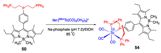 In light of utilizing 99mTc-containing ligands in single-photon emission computed tomography (SPECT), dye 54 was prepared (Scheme 17) [53]. Radio-HPLC, under in vitro simulated conditions (1 mM cystine, 10 mM [PO4]3–, pH 7.2, 37 °C), revealed that 54 remained stable up to 18 h. Thus, 54 was proven to be a viable bimodal (fluorescence imaging/BODIPY and Tc-metal/SPECT) biological probe.