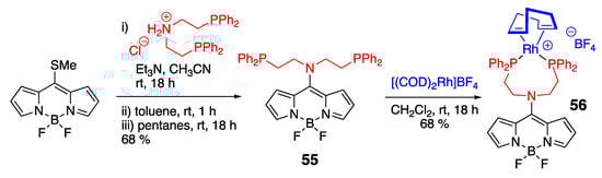 A structurally similar amino-diphosphine BODIPY 55 was used for the synthesis of Rh-containing 56 (Scheme 18) to explore the potential of the BODIPY scaffold in controlling catalytic activity [54]. Notably, the fluorescence quantum yield of 56 (Φf = 0.07) was higher than that of 55 (Φf = 0.04), although both exhibited low quantum yields in absolute terms. This was attributed to the flexibility of the nitrogen substituents, which likely facilitated non-radiative decay and limited fluorescence efficiency. Upon complexation with Rh, the reduced flexibility of the side arms in 56 appeared to mitigate that effect. Importantly, 56 demonstrated efficient catalytic activity in the hydroboration of alkenes (e.g., styrene, 1-hexene, (+)-limonene, and β-pinene), albeit its performance was inferior in hydrogenation, hydrosilylation, and hydroacylation reactions [54].