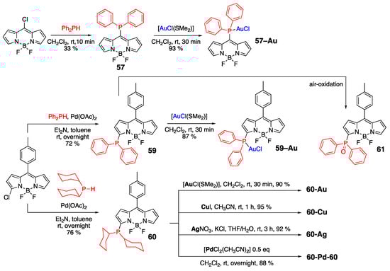 It was further proposed that the involvement of the non-bonding electrons of phosphorus in PET processes in the excited state could account for the non-emissive nature of dye 57 and related dyes 59 and 60 (Scheme 19) [56]. Electronic communication between phosphorus and the BODIPY core was supported by 31P NMR, which showed a triplet associated with a long-range P–F coupling (e.g., 59 4JP–F = 45 Hz and 60 4JP–F = 52 Hz). Notably, this coupling decreased or almost disappeared upon metal complexation with gold (59-Au 4JP–F = 15 Hz and 60-Au 4JP–F < 2 Hz), and the corresponding dyes exhibited pronounced enhancement of the fluorescence emission. Interestingly, the nature of the metal appeared to strongly contribute to emission of 59-metal and 60-metal complexes. For instance, based on the quantum yields, 60-Au (Φf = 0.09) and 60-Ag (Φf = 0.07) dyes were more emissive than 60-Cu (Φf = 0.02), while dimeric 60-Pd-60 (Φf < 0.001) was non-emissive. Consistent with these findings, the phosphine oxide derivative of 59, i.e., dye 61, where the electron pair on the phosphorus atom was removed from the conjugation with BODIPY, was also fluorescent [56].