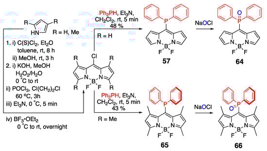 Furthermore, while 57 exhibited OFF-ON fluorescence response upon oxidation to 64 (i.e., sensing of NaOCl) [58], which is consistent with the removal of PET, its non-rotating analogue 65 (featuring methyl groups in 1- and 7-positions) did not display a fluorogenic response upon oxidation to 66. This lack of fluorogenic response was attributed to the formation of a distorted structure, which was prone to thermal deactivation processes. However, the absorption of 65 (red solution) underwent a significant red shift (ca. 50 nm) upon conversion to phosphine oxide 66 (blue solution) as a result of NaOCl-induced oxidation. This pronounced shift might suggest the potential utility of 65 as a naked eye-detection sensor [58].
