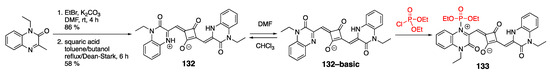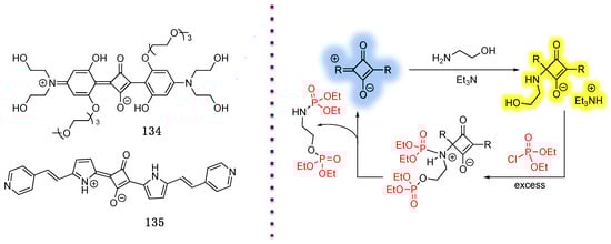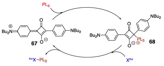 The electrophilicity of the four-membered ring in squaraine dyes presents not only challenges for squaraine modification, but it also provides opportunities to expand their structural diversity and applications. For instance, several sensors and chemodosimeters (i.e., chemosensors in which optical responses are induced by the formation of a covalent bond with the analytes) have been developed based on reversible nucleophilic addition of thiols to squaraines. P-containing nucleophiles, such as P(n-Bu)3 and P(NMe2)3, were shown to react with squaraine dyes, such as 67, to produce novel chemodosimeters 68 (Scheme 22) [59]. Specifically, the rapid and efficient addition of phosphines to squaraine dyes led to stable adducts that were easily isolated simply by solvent removal and subsequent recrystallization. Notably, P(p-MeO-C6H4)3 exhibited a reversible, temperature-dependent, yet less efficient, addition to 67.