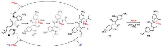 Subsequent studies [60,61] identified that incorporation of ortho-NHAc and ortho-OH groups onto squaraine scaffold gave dyes 69 and 70 (Scheme 23), which were shown to react with P(nBu)3 to form 71 and 72 via an unusual dearomative rearrangement [60]. Interestingly, in solution, these P-adducts (e.g., 71) appeared to exist in equilibrium with the respective squaraines (e.g., 69), as judged by the concentration-dependent 1H NMR spectra. A decrease in concentration of 71 from 100 mM to 100 μM corresponded to a 0–25% increase in 69. Furthermore, the absorption spectra of 71 (ca. 5 μM range) exhibited a measurable absorption in the 685 nm range, which corresponded to the λabsmax of 69, respectively.
