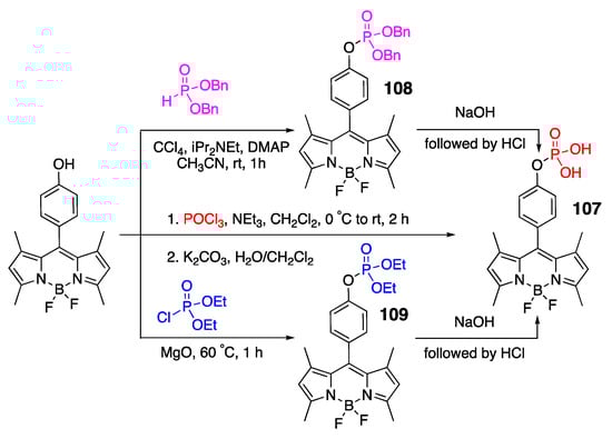 - Jacob, M.; Schmitt, A.; Jung, G. Disabling photoinduced electron transfer in 4,4-difluoro-8(-4’-hydroxyphenyl)-1,3,5,7-tetramethyl-4-bora-3a,4a-diaza-s-indacene by phosphorylation. J. Fluoresc. 2008, 18, 639–644. [Google Scholar] [CrossRef] [PubMed]
