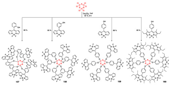 - Eserci, H.; Öztürk, E.; Okutan, E. Novel BODIPY-bridged cyclotriphosphazenes. Turk. J. Chem. 2020, 44, 74–86. [Google Scholar] [CrossRef] [PubMed]