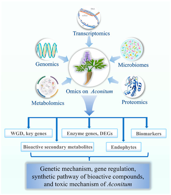 Therefore, in order to genetically intervene to increase the expression of targeted metabolites and obtain DA components, elucidating the biosynthesis pathway of Aconitum DAs is necessary. This is vital for sustainable Aconitum resource utilization. The use of genomics, transcriptomics, proteomics, metabolomics, and other omics has become prevalent in medicinal plant research thanks to advancements in detection techniques and analytical tools [27,28]. The application of omics technologies can be helpful in analyzing the chemical structure, metabolic pathway, and gene regulation pattern of active secondary metabolites, which provides researchers with the opportunity to better understand plant natural product biosynthesis, analyze the genes and pathways involved in plant primary metabolite biosynthesis, and provide theoretical and technical support for developing and utilizing plant resources [29]. Therefore, the omics method has great potential in Aconitum. Previous reviews on Aconitum species have primarily focused on their genetic diversity and biosynthetic pathways of active components [13,26]. This review focuses on the latest research progress in Aconitum based on various omics (Figure 1), including previously unreviewed research areas such as genomics, proteomics, and microbiome studies. Additionally, we discuss the limitations of the current study. Finally, a prospective topic for the further study of Aconitum medicinal plants has been put forward.