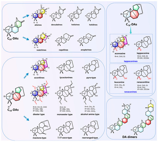 Classification of DA structures in the genus Aconitum. DAs are classified into C20-DAs, C19-DAs, C18-DAs, and DA dimers based on the number of carbon atoms and chemical structure types. The carbon numbering for the typical chemical structure is labeled in the figure.