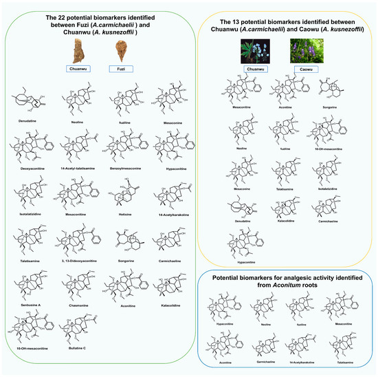 - Zhao, D.; Shi, Y.; Zhu, X.; Liu, L.; Ji, P.; Long, C.; Shen, Y.; Kennelly, E. Identification of Potential Biomarkers from Aconitum carmichaelii, a Traditional Chinese Medicine, Using a Metabolomic Approach. Planta Med. 2018, 84, 434–441. [Google Scholar] [CrossRef]