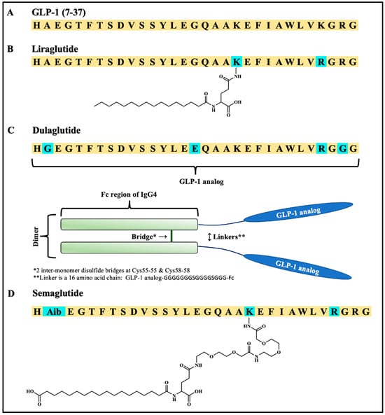 GLP-1 and selected FDA-approved GLP-1 analogs. (A) GLP-1 [4], (B) liraglutide [5], (C) dulaglutide [6], and (D) semaglutide [7]. Liraglutide, dulaglutide, and semaglutide are built off the GLP-1 (7–37) fragment. The lipid moieties of liraglutide and semaglutide are linked via γ-L-glutamic acid (γ-Glu). This figure is an approved reproduction taken from the PhD dissertation of Jonathon Sawyer [8].