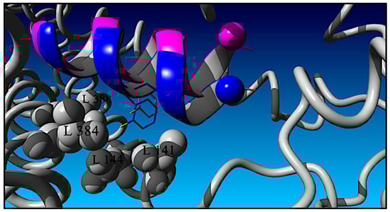 As alluded to previously and discussed in what follows, the data and QSAR analysis presented here validate the RXL-3000:GLP-1R structural binding model that is based on the TPA:GLP-1R cryo-EM (PDB: 5NX2) structure as opposed to the full-length GLP-1 ligand GLP-1:GLP-1R X-ray structure (PDB: 6X18). The TPA-based model of the RXL-3000 ligand in complex with GLP-1R is presented in Figure 5 with GLP-1R as a grey ribbon and the RXL-3000 ligand as a blue ribbon. Figure 5 emphasizes the RXL-3000 residue Phe(2-F)6 and its side chain configuration with respect to GLP-1R. The RXL-3000 C-terminal NH2 group is depicted as a blue vdw sphere. The RXL-3000 Phe(2-F)6 side chain is shown in blue as a stick figure, and its fluorine atom is shown in yellow. GLP-1R side residues in close contact (<4.0 Å) with the RXL-3000 Phe(2-F)6 fluorine atom are depicted as vdw spheres and are colored in grey (L141, L144, L384, and L388). For comparison, the GLP-1-based RXL-3000 ligand pose is shown in magenta. In the GLP-1-based model, the N-term of RXL-3000 is offset into the page and is oriented up, while the C-term is inserted slightly deeper in the GLP-1R pocket with respect to RXL-3000 in the TPA-based model. Globally, the two ligands differ by ≈ 2.4 Å in terms of their heavy atoms. The Phe(2-F)6 side chain of the TPA-based model is inserted deeper into and packed more tightly in the leucine hydrophobic pocket lined by the GLP-1R residues L141, L144, L384, and L388 than is the Phe(2-F)6 side chain of the GLP-1-based model. The distance between the two modeled coordinates of the Phe(2-F)6 fluorine atoms is 1.49 Å. Finally, it should be noted that the heavy atom coordinates of the two GLP-1R receptor models are significantly different, with an RMSD of ≈7.6 Å.