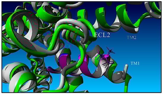 A top-down view of the TPA GLP-1R structure-based binding model of RXL-3000/GLP-1R is shown Figure 6. The N-terminal extracellular portion of GLP-1R is omitted for clarity. The TPA-based model of RXL-3000 complexed with the GLP-1R 7-transmembrane helix is colored in grey and is depicted coming out of the page, while the GLP-1-based GLP-1R 7-transmembrance helix is colored in green. The C-terminal amide moiety of the TPA-based model of RXL-3000 is represented as a sphere and is colored in blue along with the rest of the peptide, while the GLP-1-based model of the RXL-3000 helix is colored in magenta. The TPA-based model of RXL-3000’s Bip10 side chain is positioned between TM2 (residues 174–205) and TM1 (residues 139–169) of GLP-1R, with the first phenyl ring in a “flat” face-up orientation and the second phenyl ring in a “line” side view orientation. By way of comparison, both GLP-1-based Bip10 side chain phenyl groups (magenta) are positioned between TM1 and TM2 in the flat orientation. The Bip11 side chains in both the TPA-based model and the GLP-1-based model are oriented toward the ECL2 (residues 292–302) of GLP-1R. The TPA-based model of RXL-3000’s Bip11 side chain has a flat-line phenyl group configuration, while the GLP-1-based model of RXL-3000’s Bip11 side chain has a flat-flat phenyl ring configuration. It is noted that the coordinates of ECL2 for the GLP-1- and TPA-based GLP-1R complexes differ by ≈2.57 Å.