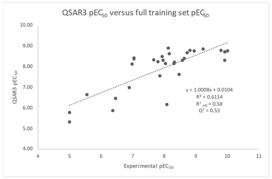Plot of pEC50 values calculated using the QSAR3 model versus the 31 experimentally measured full training set pEC50 values.