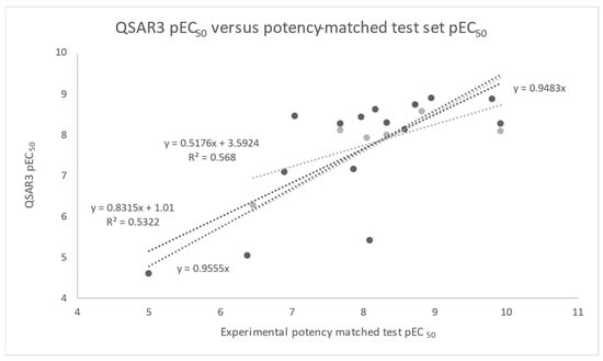 Plot of pEC50 values calculated using the retrained QSAR3 models versus the 15 (black) and 6 (grey) experimentally measured potency-matched test sets 1 and 2’s pEC50 values, respectively. The graph includes best-fit lines with constants (y = mx + b) and best-fit lines forced through the origin (y = mx). The best-fit lines for test set 1 are y = 0.8315x + 1.01 and y = 0.9555x; the best-fit lines for test set 2 are y = 0.5176x + 3.5924 and y = 0.9483x.