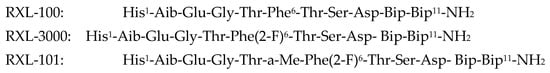 A quantitative comparison was made between the previously reported [9] GLP-1 Ala-scan analog results of Adelhorst et al. and the results for the RXL-3000 Ala-scan analog data presented here (see Supplementary Figure S7). In brief, the pEC50 values of the GLP-1 Ala-scan variants and the ten pEC50 values of the corresponding RXL-3000 variants (RXL-3001, RXL-3003, RXL-3037, RXL-3004, RXL-3038, RXL-3005, RXL-3006, RXL-3007, RXL-3008, and RXL-3009) did not show a correlation (R2 = 0.0098). In contrast, a significant correlation of R2 = 0.66 was observed between the previously reported GLP-1 Ala-scan analog pIC50 data [9,10]. This suggests that ultra-small RXL-3000 peptides bind to and activate GLP-1R in a different manner than full-length GLP-1 peptides. It can be further hypothesized that RXL-3000 binds and activates GLP-1R in a manner similar to the TPA peptide.