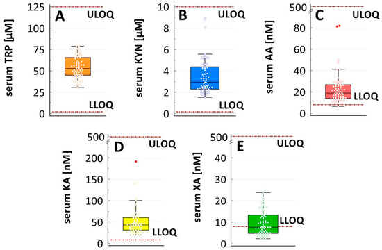 - Nadour, Z.; Simian, C.; Laprévote, O.; Loriot, M.-A.; Larabi, I.A.; Pallet, N. Validation of a Liquid Chromatography Coupled to Tandem Mass Spectrometry Method for Simultaneous Quantification of Tryptophan and 10 Key Metabolites of the Kynurenine Pathway in Plasma and Urine: Application to a Cohort of Acute Kidney Injury Patients. Clin. Chim. Acta 2022, 534, 115–127. [Google Scholar] [CrossRef] [PubMed]