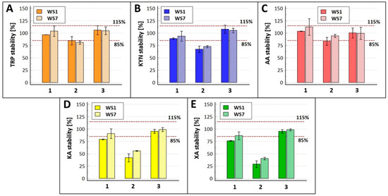 - Heng, B.; Pires, A.S.; Chow, S.; Krishnamurthy, S.; Bonnell, B.; Bustamante, S.; Guillemin, G.J. Stability Studies of Kynurenine Pathway Metabolites in Blood Components Define Optimal Blood Processing Conditions. Int. J. Tryptophan Res. IJTR 2023, 16, 11786469231213521. [Google Scholar] [CrossRef]