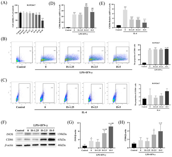 Inosine promoted macrophage polarization toward the M1 phenotype. (A) RAW264.7 cells were treated with inosine (0–40 mM) for 24 h; then, an MTT assay was performed to observe cell viability. RAW264.7 cells were administrated with inosine (1.25, 2.5, and 5 mM) in the absence or presence of LPS+IFN-γ or IL-4. (B,C) The proportions of CD86 and CD206-positive cells were determined by a flow cytometer. (D,E) The expression levels of CD86 and CD206 mRNA were detected by RT-qPCR. (F–H) Levels of CD86 and iNOS were measured by WB. Compared to the control group: * p < 0.05, ** p < 0.01, *** p < 0.001; Compared with the LPS+IFN-γ induced M1 group: # p < 0.05, ## p < 0.01, ### p < 0.001; Compared with the IL-4 induced M2 group: ΔΔΔ p < 0.001.