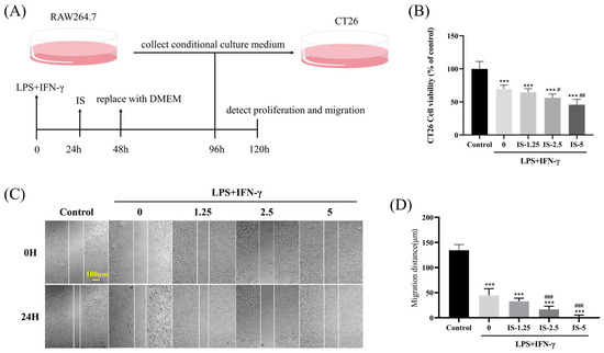 Inosine may exert an inhibitory effect on the progression and metastasis of CT26 cells by affecting macrophage polarization toward M1. (A) Schematic depicting the co-culture system and the experimental approach. (B) CT26 cells were treated for 24 h using a conditioned medium, and an MTT assay was used to measure the proliferation of CRC cells. (C) Wound healing was used to measure the metastasis of CRC cells (scale: 100 μm; 10×). (D) CT26 cells metastasis distance statistics. Compared to the control group: *** p < 0.001; Compared with the LPS+IFN-γ induced M1 group: # p < 0.05, ## p < 0.01, ### p < 0.001.