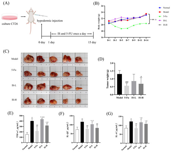 Anti-tumor efficacy of inosine in CT26 tumor-bearing mice. (A) Schematic diagram of mouse model establishment and administration. Mice were administered once daily for 14 days. (B) Mice were subjected to body weight measurements performed at regular intervals of 2 days. (C) Photographs of dissected mouse tumors at 15 days of modeling. (D) Evaluation of tumor weight. (E–G) Changes in serum levels of TNF-α, IL-1β, and IL-4 in mice of different groups. Note: 5-Fu are 5-Fu (12 mg/kg) groups. IS-L and IS-H are inosine low and high-dose (5 mg/kg and 50 mg/kg) groups, respectively. Compared to the normal group: * p < 0.05, ** p < 0.01; Compared with the model group: # p < 0.05, ## p < 0.01, ### p < 0.001; Compared with the 5-Fu group: △ p < 0.05, △△ p < 0.01.