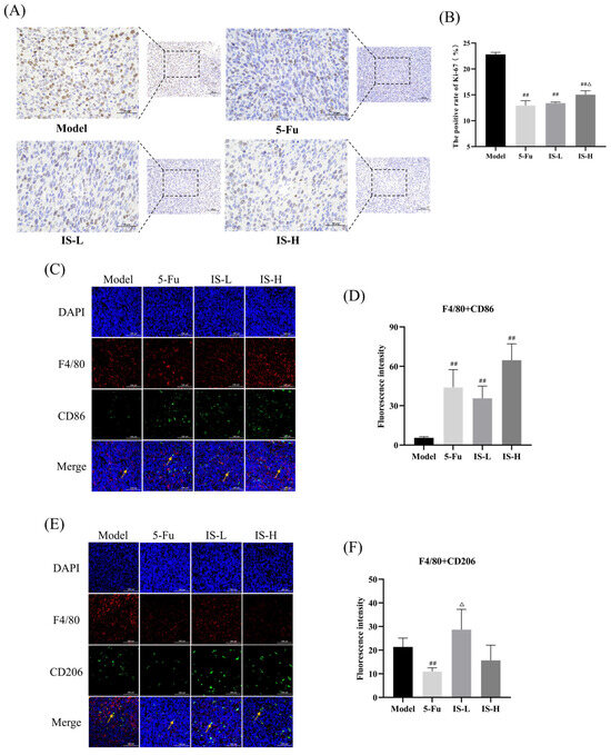 Effects of inosine on immune factors in the CT26 tumor microenvironment. (A) Effect of inosine on Ki-67 expression in tumor tissues (Scale: 100 μm; 400× and 200×). (B) Statistics of Ki-67 protein positive expression in tumor tissues (n = 3). (C) Fluorescence co-localization fluorogram of M1-type macrophage marker F4/80 + CD86 (scale: 100 μm; 200×). (D) F4/80 + CD86 expression statistics in tumor tissues. (E) M2 type macrophage marker F4/80 + CD206 fluorescence co-localization fluorogram (scale: 100 μm; 200×). (F) F4/80 + CD206 expression statistics in tumor tissues. Note: 5-Fu are 5-Fu (12 mg/kg) groups. IS-L and IS-H are inosine low and high-dose (5 mg/kg and 50 mg/kg) groups, respectively. Yellow arrows represent positive positions. Compared with the model group: ## p < 0.01; Compared with the 5-Fu group: △ p < 0.05.