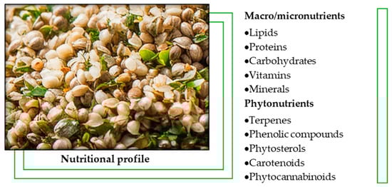 Hemp seeds (Cannabis sativa L.) have significant nutritional and pharmacological value [1,2,3], being an important source of macronutrients, micronutrients, and phytochemicals (Figure 1). The main constituents of the seeds include easily digestible proteins (20–25%), such as edestin and albumin, which contain all essential amino acids and are suitable for both human and animal consumption. Hemp seeds are rich in polyunsaturated fatty acids (PUFA) (25–35%), especially linoleic acid (LA, omega-6) and alpha-linolenic acid (ALA, omega-3), in an optimal 3:1 ratio for human nutrition. Additionally, the seeds contain a significant proportion of carbohydrates (20–30%), most of which are insoluble fibers essential for digestive health [4,5].