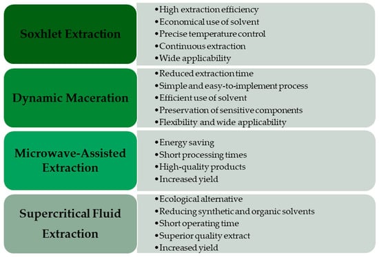 Supercritical fluid extraction (SFE) is an environmentally friendly method that uses supercritical carbon dioxide to extract compounds from seeds, offering an efficient and selective technique. Figure 2 presents the advantages of using the supercritical fluid extraction method compared with conventional methods. This advanced method minimizes contamination risk and is ideal for obtaining high-quality hemp seed extracts [21].