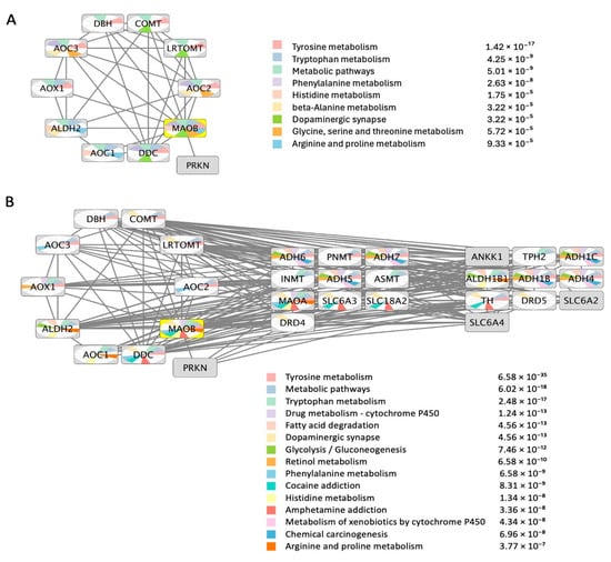 MAO-B protein-protein interaction networks. (A) Direct interactions network created using nearest neighbor proteins/genes. (B) An expanded interactions network was created by allowing the addition of 20 more seed nodes to the direct interactions network. The nodes are color-coded using a split pie chart coloring scheme indicating pathway contribution to each node from the topmost significant KEGG enrichments.