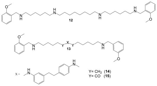 The polyamine skeleton represents a universal template as the insertion of appropriate moieties on amine groups and the type of linker between them can modulate selectivity and affinity toward a given receptor or enzyme [81]. Some polyamine-based analogs can inhibit amine oxidases, such as human MAOs [82]. Emanuela et al. (2012) have demonstrated a decrease in the flexibility of the inner polymethylene chain of methoctramine (12) and its polyamine-based analogs (13) such as the di-piperidine analog, resulting in an active and reversible MAO B inhibitor [82]. In 2023, Nordio et al. reported several polyamine analogs (13) that are structurally related to compound (12) and are characterized by constrained linkers between the inner amine functions of the polyamine backbone (Figure 5) [5]. Considering the overexpression of MAOs in glioblastoma and the effects of MAOIs in glioma progression, the role of these analogs on the MAO inhibitory activity and the anti-proliferative activity were investigated. These analogs are distinguished by constrained linkers between the inner amine functions of the polyamine backbone. It was verified that a decrease in the flexibility of the inner polymethylene chain of methoctramine (compound 12) is favorable to MAO B inhibitory activity. Two of these analogs (14 and 15) were found to join these activities, exhibiting remarkable anti-proliferative activity in LN-229, a human glioblastoma cell line (GI50 < 1 µM) with almost by more than two orders of magnitude with respect to compound 12, noting that compound 12 was used as a reference having GI50 > 20 µM [5].